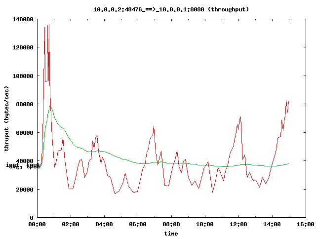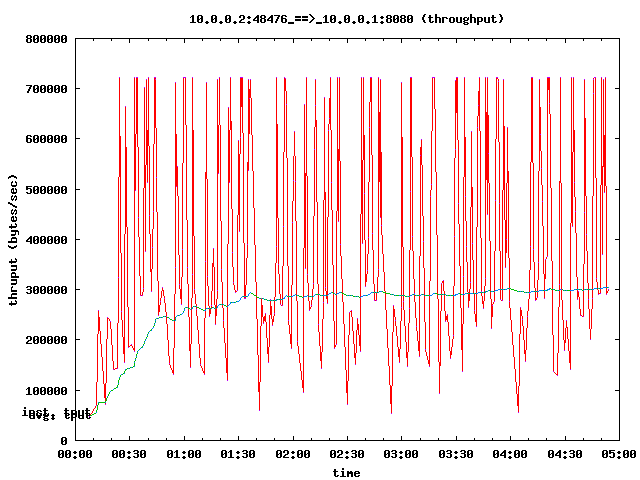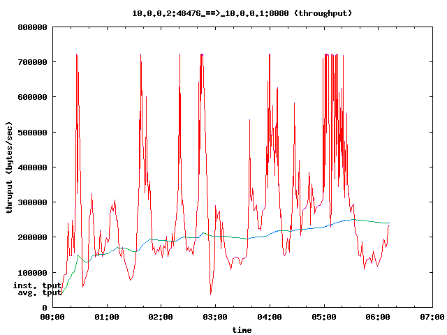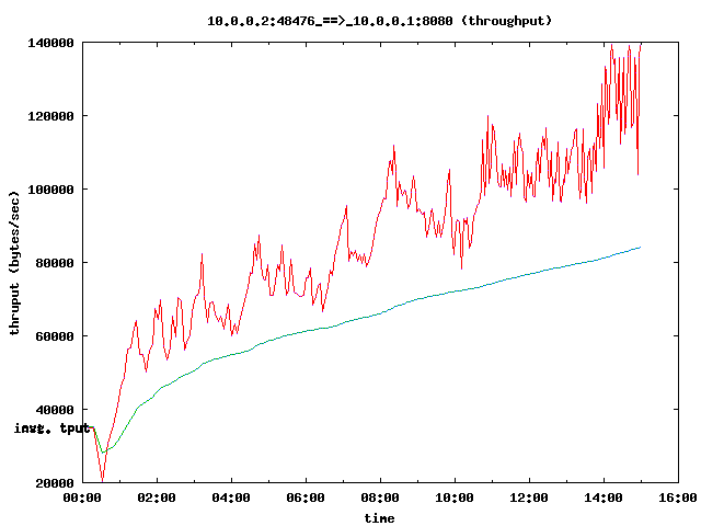 This is examples/tcp-nsc-lfn.cc, modified so it only has a single TCP flow. This is a simple point to point connection with high delay (half a second), decent bandwidth (6 MBit). The connection is lossy (about 14 percent packet loss). All throughput plots were created using tcptrace -y -T -A200 and the Linux 2.6.26 stack using ns-3 and the network simulation cradle.